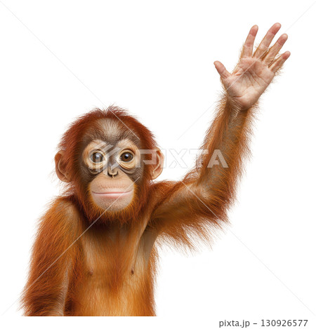 A young orangutan with bright orange fur raises its hand in playful gesture, showcasing its expressive face and curious nature. background is plain, highlighting animal