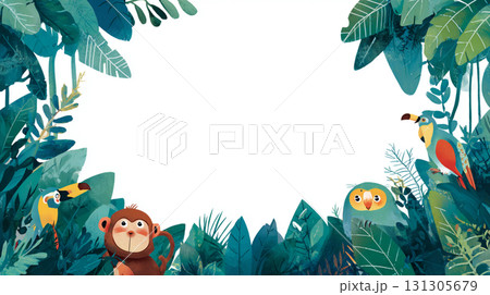 Cartoon Illustration Jungle Animal Frame with Exotic Foliage Border Graphic