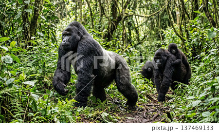 銀背大猩猩與一群大猩猩在叢林中移動,全身照