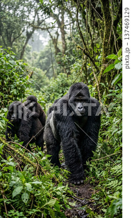 Gorilla peers through lush greenery in a misty forest landscape