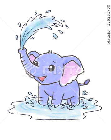 一幅可愛的插圖,描繪了一頭大像用鼻子噴水的場景。