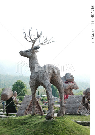 The deer puppet is made from woven straw into the shape of a large deer on green grass at Huay Tung Tao Reservoir