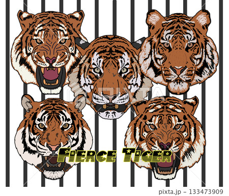 Vector of huge collection of powerful tiger head designs with snarls and stripes in various vector styles for mascots and apparel. Wild Animals.