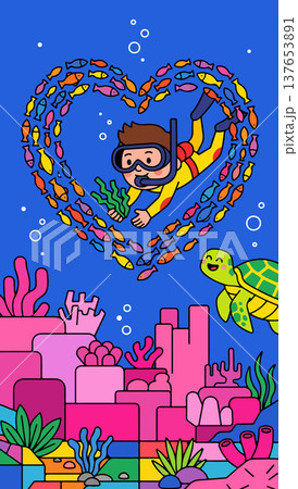 Cartoon Diver with Fish Heart and Turtle