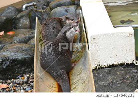 兩隻亞洲小爪水獺躲在溜滑梯裡