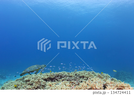 綠海龜等生物在珊瑚礁上悠閒地巡弋。美麗的珊瑚礁和成群的熱帶魚。島尻郡慶良間諸島的座間味島和阿室島