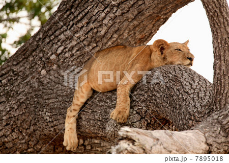 Lion cub sleeping in tree, Selous National Park, Tanzania, Africa