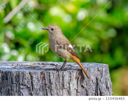 一隻雌性達烏爾紅尾鴝棲息在樹樁上