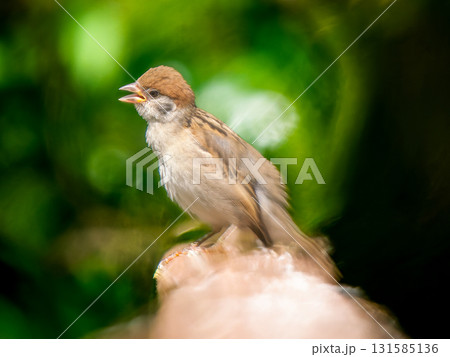 一隻雌性白喉麻雀在沐浴後抖動羽毛