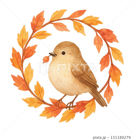 秋葉花環和小鳥水彩插畫素材秋天可愛的動物人物PNG