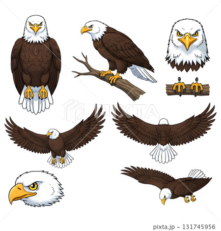 Majestic eagle vector illustrations in various poses: flying, perched, and standing, symbolizing freedom and power. Birds.