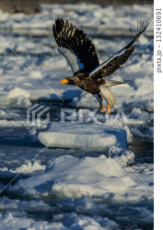 一隻虎頭海雕飛過北海道羅臼海岸的流冰