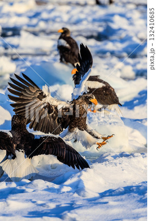 兩隻虎頭海鵰和一隻白尾海鵰在浮冰上爭搶一條魚