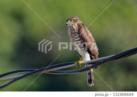 一隻幼年雀鷹在鎮上的電線上尋找獵物。