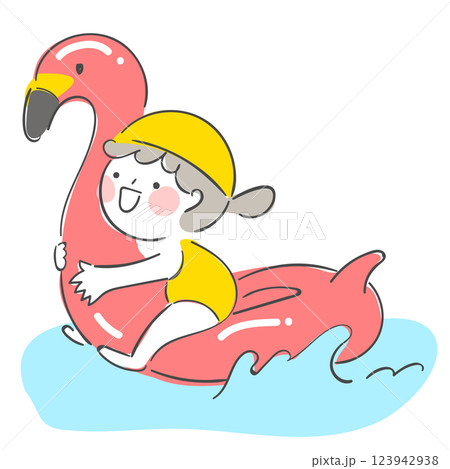 一個可愛的貓咪角色戴著火烈鳥游泳圈,在海裡享受游泳的變形插圖