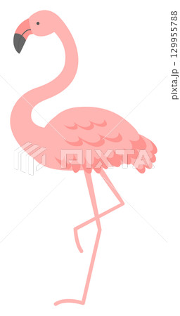 Whimsical illustration of a pink flamingo standing on one leg and wearing red high heels. This fun and stylish cartoon design is perfect for children projects, summer party invitations.