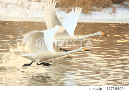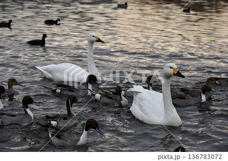 黃昏時分,兩隻美麗的白天鵝在湖面上悠然游弋,地點:埼玉縣川町