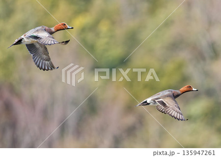 早春時節,北針尾鴨在宮城縣藏王町的河岸邊巡遊。