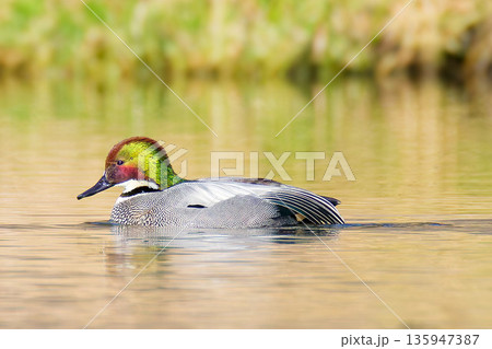 冬日黃昏,一隻長尾鴨在池塘游泳,地點:埼玉縣川島町