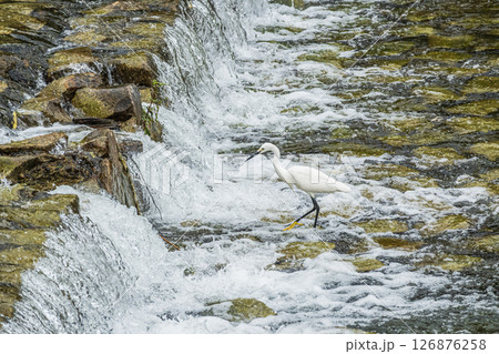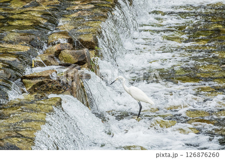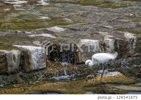 京都市鴨川水壩下,一隻小白鷺正在覓食
