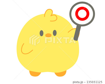 一隻可愛的小雞舉著一個圓形的標誌牌的插圖