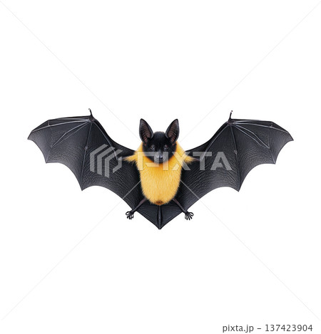 Bat with black wings and vibrant yellow chest is depicted in flight against transparency background, showcasing its unique coloration and wing structure