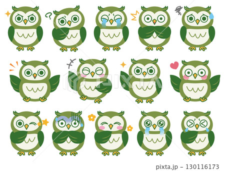 貓頭鷹各種臉部表情插圖集04(綠色)