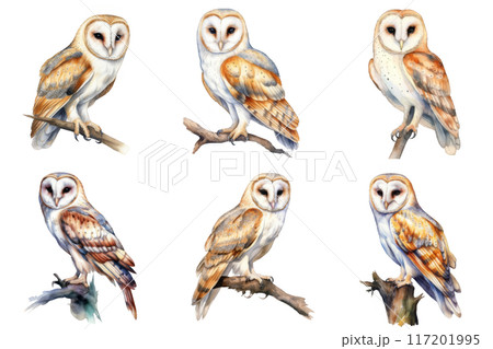 Six Barred Owls Perched on Branches in a Watercolor Style