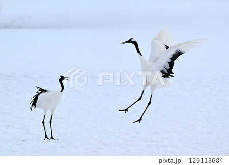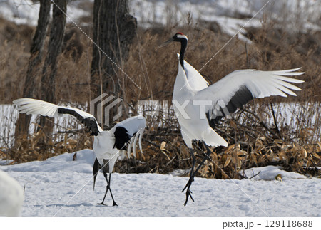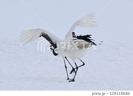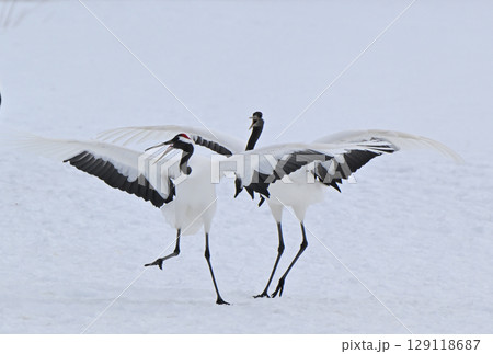 北海道鶴居村的一對丹頂鶴正在表演求偶舞