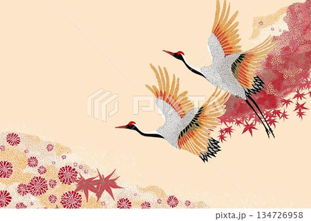 描繪鶴群在圖案和雲朵間翩翩起舞的插圖