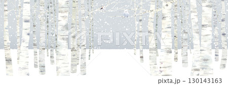 白雪皚皚的樺樹林風景。水彩插圖。 (向量圖。佈局可更改。)