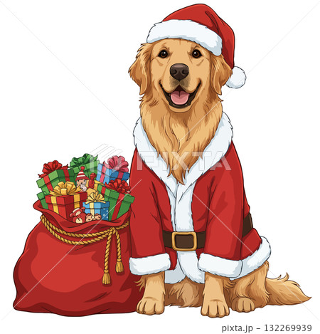 Happy Golden Retriever dog in a Santa Claus costume with a bag of Christmas gifts