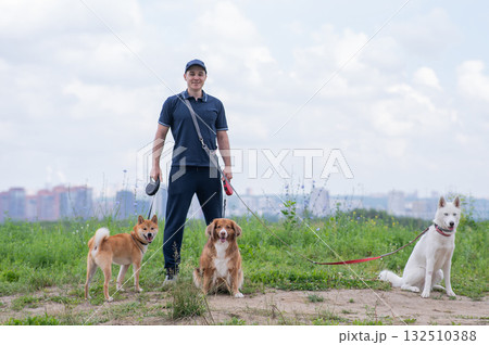 dog walker, dog handler on a walk with their pets. owner of the pet walks through meadow of park