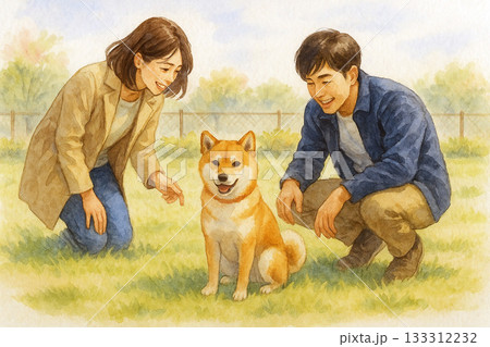 一對日本夫婦和一隻紅色的柴犬在初春時節漫步於公園中。