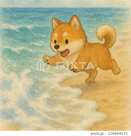 元気に海辺を走る柴犬の水彩イラスト Energetic shiba inu running by t