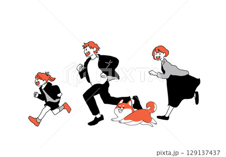 一家人與柴犬一起奔跑的插圖(父親、母親、女兒、狗)