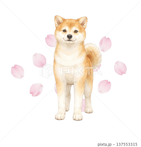 櫻花花瓣與柴犬水彩插畫,春季可愛狗狗素材