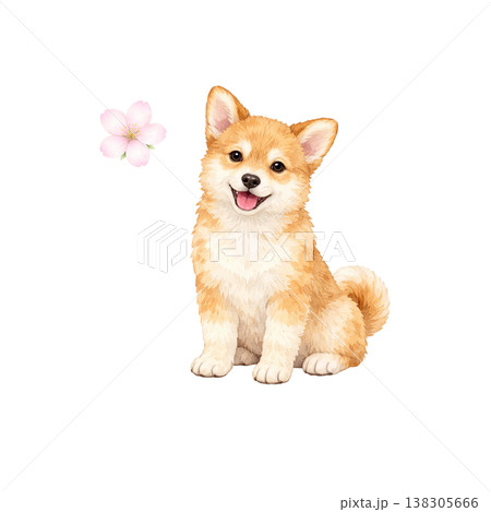 柴犬與櫻花的水彩插畫。可愛的狗狗圖案,非常適合春天。