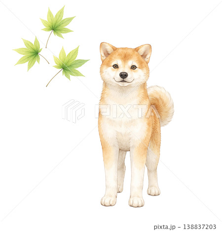 柴犬與楓葉水彩插畫(清新綠色素材)