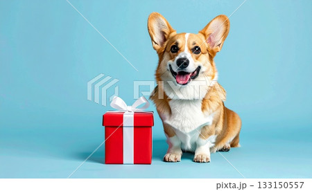 在淺藍色背景上,一隻柯基犬和紅白相間的禮物構成了一幅歡快簡約的畫面。
