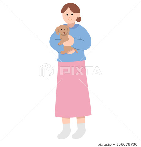 向量插圖,描繪了一名男子抱著一隻穿著狗衣服的迷你臘腸犬。