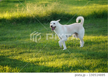 A white mongrel puppy is playing in a green field