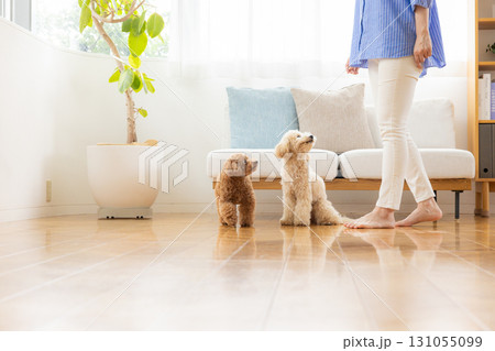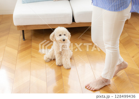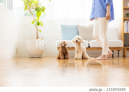 玩具貴賓犬和比熊貴賓犬與主人在客廳放鬆