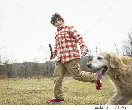 A young boy outdoors on a winter day, holding a stick and running with a golden retriever dog.