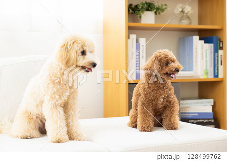 玩具貴賓犬和比熊貴賓犬在沙發上休息