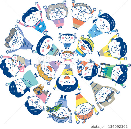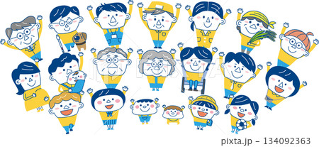 多代同堂、多元化的社區:兒童、老人、外國人、輪椅使用者和導盲犬的向量插圖