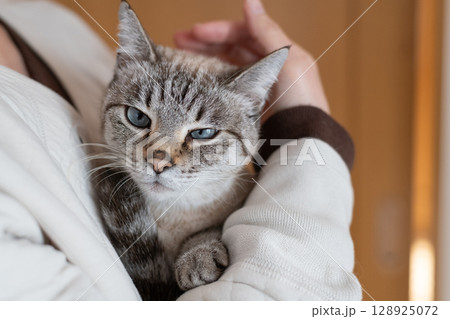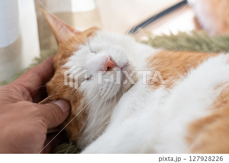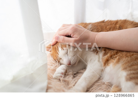 A person is softly petting a relaxed cat in a cozy, warm indoor environment. The cat appears content, enjoying the attention while nestled comfortably.