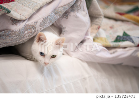 一隻貓鑽進被窩就不肯出來了。