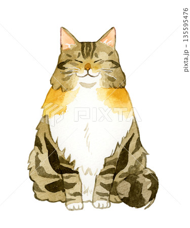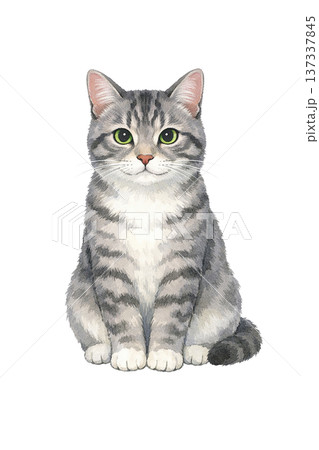 鯖魚虎斑貓水彩插畫,坐著的可愛貓咪動物素材