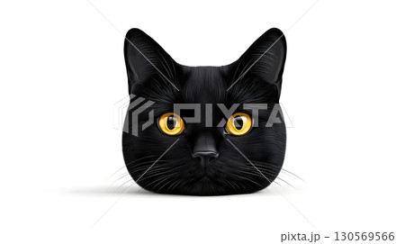 black cat portrait with piercing yellow eyes against a minimalist white background.